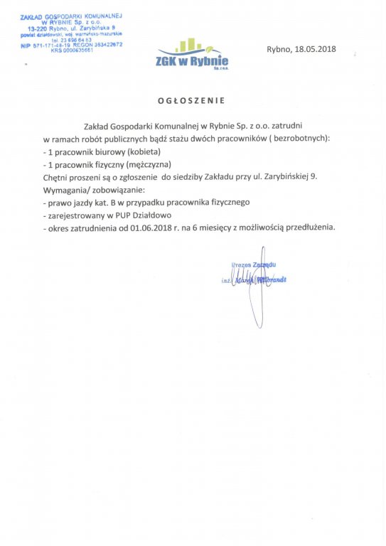 Zakład Gospodarki Komunalnej w Rybnie spółka z o.o. pozyskał środki na zatrudnienie w ramach robót publicznych lub stażu dwóch pracowników/bezrobotnych. Chętne osoby proszone są o zgłoszenie się do siedziby Zakładu przy ulicy Zarybińskiej 9 w Rybnie.