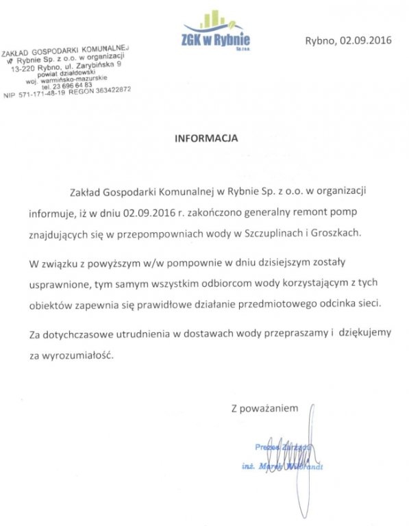 Zakład Gospodarki Komunalnej w Rybnie Sp. z o. o. informuje, iż w dniu 02.09.2016r. zakończono generalny remont pomp znajdujących się w przepompowniach wody w Groszkach i Szczuplinach.