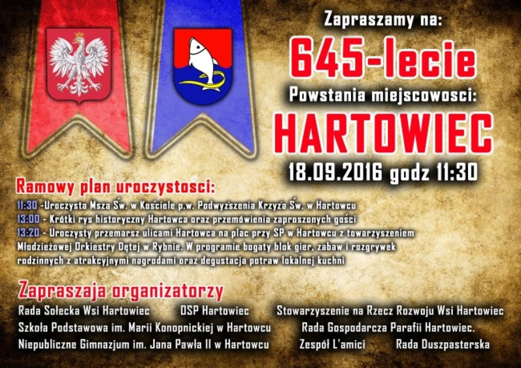 Dnia 18.09.2016 zapraszamy do udziału w obchodach 645-lecia powstania miejscowości Hartowiec, które rozpoczną się o godz. 11:30 uroczystą Mszą Św. w Kościele p.w. Podwyższenia Krzyża Świętego w Hartowcu.