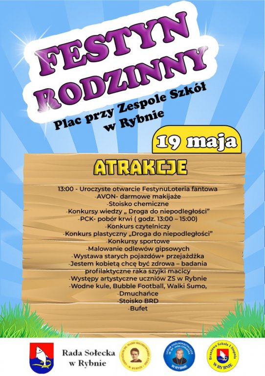 Zapraszamy na Festyn Rodzinny, który odbędzie się w sobotę 19 maja 2018r. przy Zespole Szkół w Rybnie.
