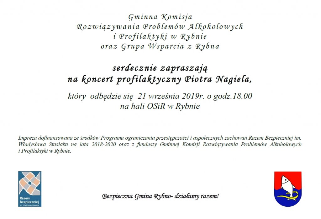 Gminna Komisja Rozwiązywania Problemów Alkoholowych i Profilaktyki w Rybnie oraz Grupa Wsparcia z Rybna serdecznie zapraszają na koncert profilaktyczny Piotra Nagiela.