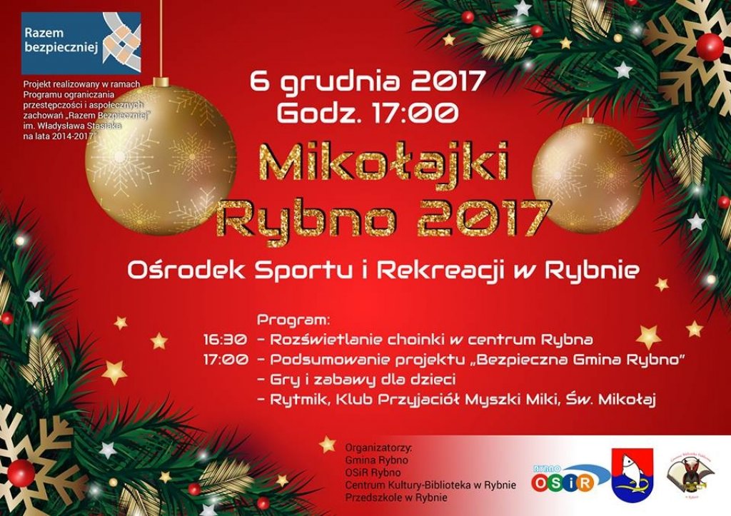 W środę, 6 grudnia o godz. 17:00 w Ośrodku Sportu i Rekreacji w Rybnie odbędą się Mikołajki dla dzieci oraz podsumowanie realizacji projektu „Bezpieczna Gmina Rybno”. Wcześniej w centrum Rybna zostanie rozświetlona choinka.