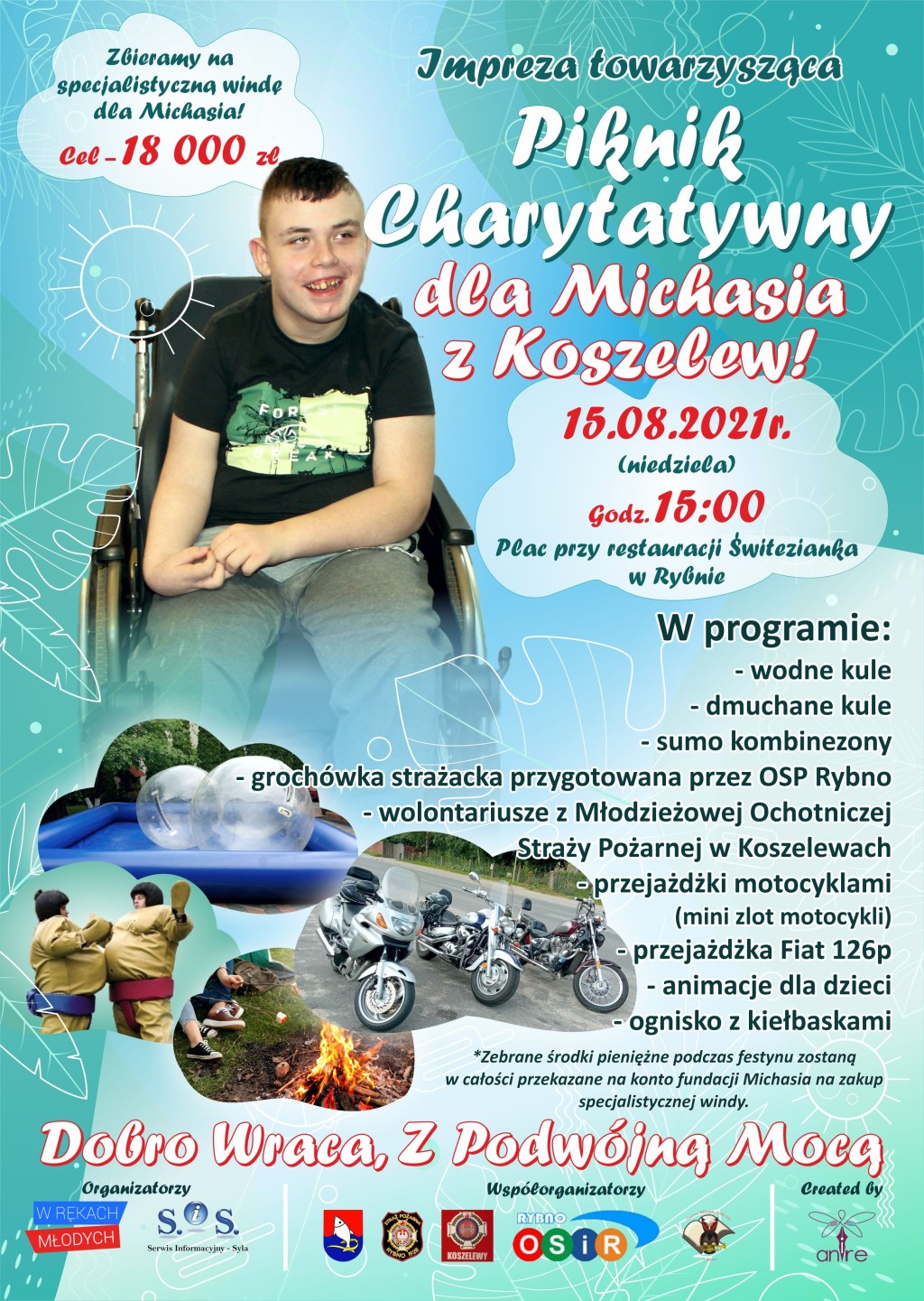 - Michał w wieku 3 lat miał straszliwy wypadek, wypadł z okna po którym doznał uraz ośrodkowego układu nerwowego. Michał ma sparaliżowane cztery kończyny, nie widzi a na dodatek cierpi na przewlekłą niewydolność oddechową i padaczkę. Od momentu wypadku minęło już 13 lat i właśnie teraz nadszedł czas aby pomóc Michałowi oraz jego rodzinie. Chłopiec potrzebuje specjalistycznej windy aby mógł swobodnie wychodzić z domu na zewnątrz, a przede wszystkim do szkoły. Mama Michała jest po ciężkiej chorobie nowotworowej, jednakże ma w sobie mnóstwo energii i robi wszystko aby Michał miał jak najlepszą opiekę. Rodzice Michała otrzymali 50% dofinansowania (18 tysięcy) z programu PEFRON na specjalistyczną windę. Drugie tyle trzeba zebrać do 10 października. Zwracamy się do mieszkańców gminy Rybno o pomoc w zbiórce charytatywnej dla Michała. Czujemy, że tak jak to było w przypadku Filipa i tym razem wspólnymi siłami może nam się to udać. Dobro wraca z podwójną mocą! – z pozdrowieniami przewodniczący grupy młodzieży „W Rękach Młodych”, Sylwester Kasprowicz.
