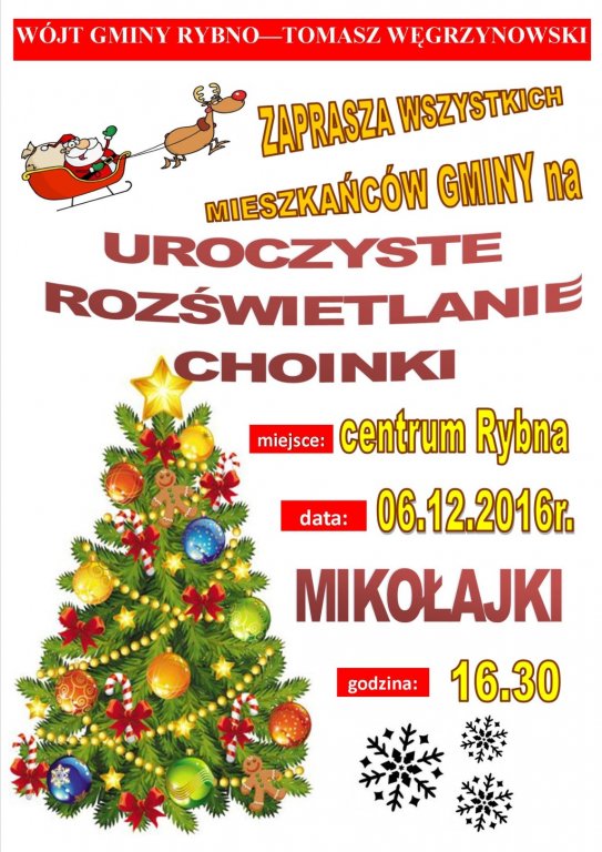 Wójt Gminy Rybno zaprasza wszystkich mieszkańców na uroczyste rozświetlanie choinki, któe odbędzie się w dniu 6 grudnia 2016 r. o godzinie 16:30 w centrum Rybna.