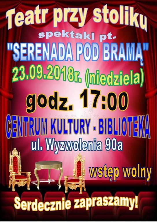 W niedzielę, 23 września 2018r. o godz. 17:00 w Centrum Kultury-Biblioteka w Rybnie odbędzie się kolejne spotkanie z cyklu „Teatr przy stoliku”.