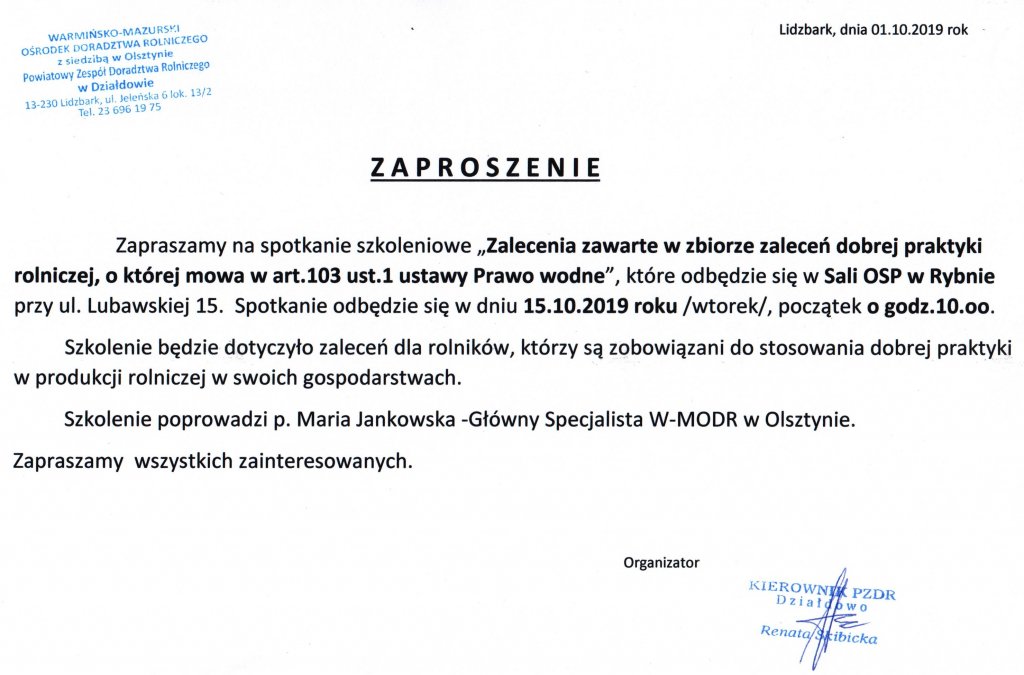 Zapraszamy na spotkanie szkoleniowe „Zalecenia zawarte w zbiorze zaleceń dobrej praktyki rolniczej, o której mowa w art.103 ust.1 ustawy Prawo wodne", które odbędzie się w Sali OSP w Rybnie przy ul. Lubawskiej 15.