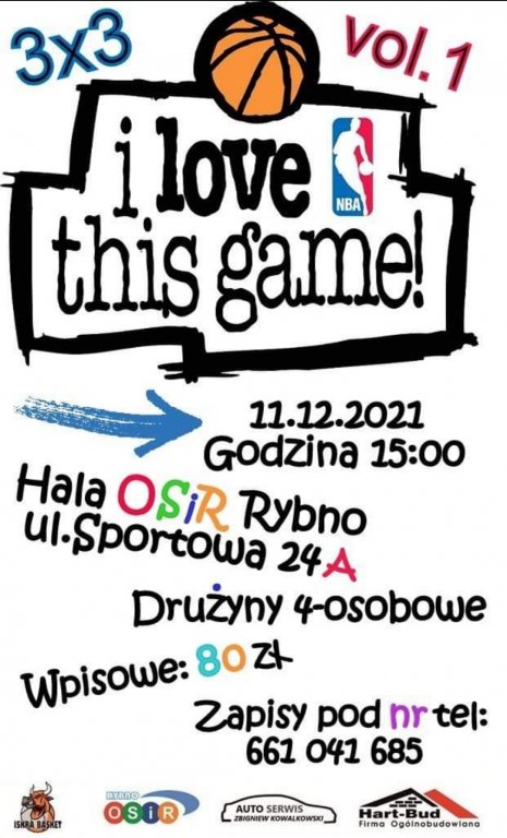 Serdecznie zapraszamy na pierwszą edycję turnieju koszykówki 3x3 pod nazwą "I LOVE THIS GAME" vol. 1., który odbędzie się w sobotę – 11 grudnia 2021r. o godz. 15:00 w hali Ośrodka Sportu i Rekreacji w rybnie. Będzie basket, muzyka, super atmosfera oraz miłe niespodzianki, przygotowane przez organizatorów. Zapraszamy!
