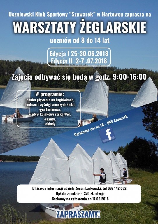 Uczniowski Klub Sportowy "Szuwarek" zaprasza na warsztaty żeglarskie uczniów od 8 do 14 lat.