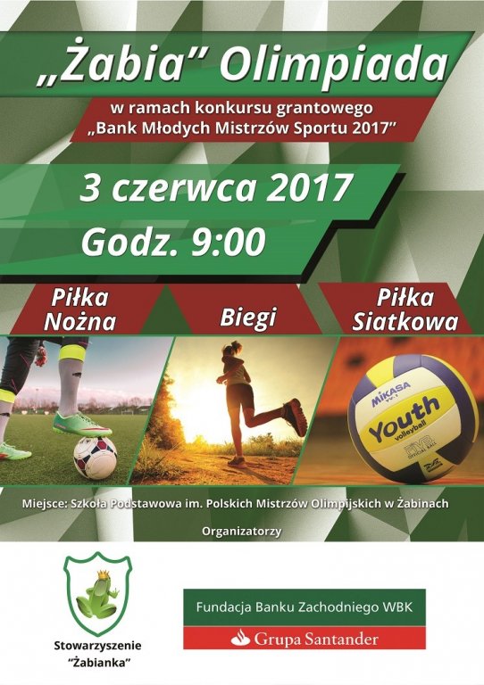 W sobotę, 3 czerwca o godz. 9:00 w Szkole Podstawowej im. Polskich Mistrzów Olimpijskich w Żabinach odbędzie się „Żabia” olimpiada, którą organizuje Stowarzyszenie „Żabianka”.