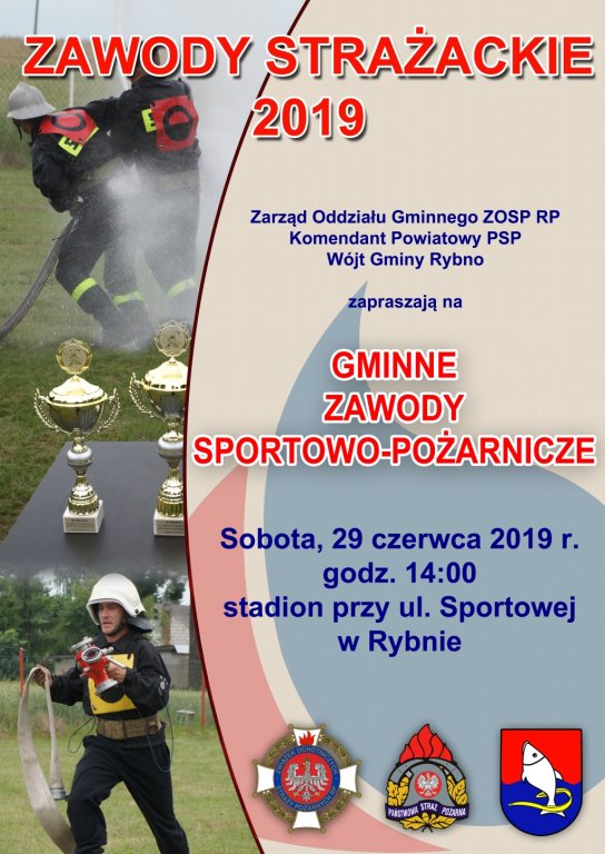 Zapraszamy na Gminne Zawody Sportowo-Pożarnicze, które dobędą się w sobotę 29 czerwca (sobota) 2019r. na stadionie przy ulicy Sportowej w Rybnie. Początek zawodów zaplanowano na godzinę 14:00.
