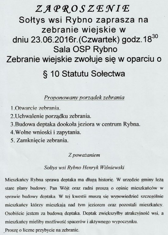 Sołtys wsi Rybno zaprasza na zebranie wiejskie w dniu 23.06.2016 (czwartek) o godz. 18:30 w sali Ochotniczej Straży Pożarnej w Rybnie.