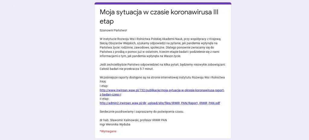 W imieniu Instytutu Rozwoju Wsi i Rolnictwa Polskiej Akademii Nauk oraz Krajowej Sieci Obszarów Wiejskich chcielibyśmy się zwrócić z prośbą o rozpropagowanie wśród mieszkańców Państwa gminy ankiety dotyczącej zmian sytuacji ludności w czasie pandemii.