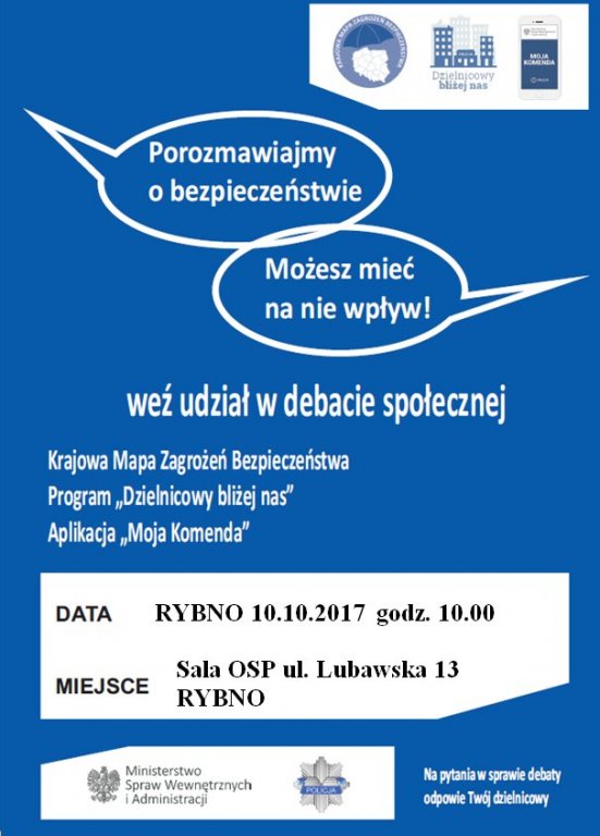 Zapraszamy do udziału w debacie społecznej dotyczącej bezpieczeństwa. Debata organizowana w ramach projektu "Bezpieczna Gmina Rybno" odbędzie się w dniu 10 października 2017r. o godzinie 10:00 w sali OSP przy ulicy Lubawskiej w Rybnie.