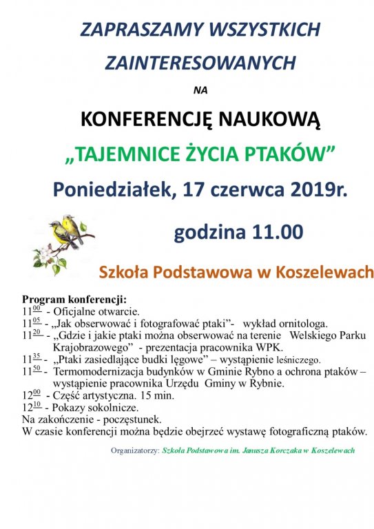 Zapraszamy wszystkie zainteresowane osoby na konferencję naukową "Tajemnice życia ptaków", która odbędzie się w poniedziałek 17 czerwca 2019r. w Szkole Podstawowej im. Janusza Korczaka w Koszelewach.