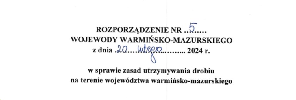 Podaje się do publicznej wiadomości, iż Wojewoda Warmińsko-Mazurski wydał Rozporządzenie nr 5 z dnia 20.02.2024 w sprawie zasad utrzymywania drobiu na terenie województwa warmińsko-mazurskiego.