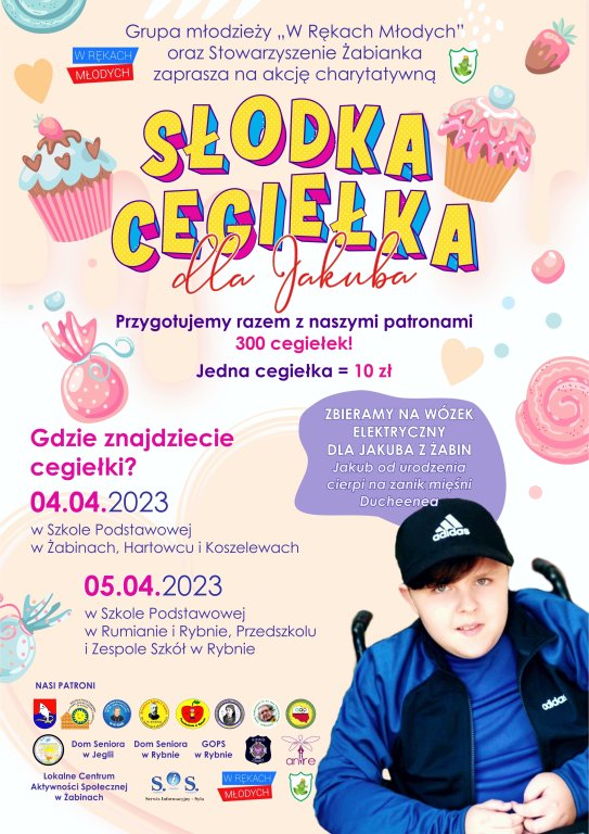 Grupa młodzieży „W Rękach Młodych” oraz Stowarzyszenie „Żabianka” serdecznie zaprasza na akcję charytatywną pn. „Słodka cegiełka dla Jakuba”!