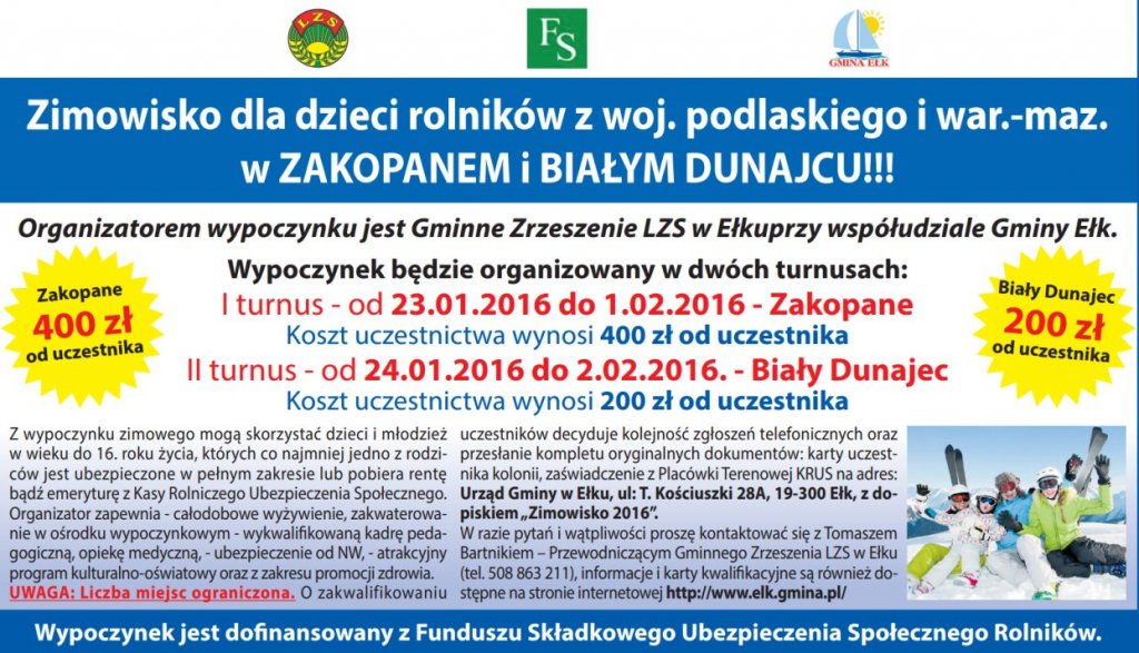 Gminne Zrzeszenie LZS w Ełku przy współudziale Gminy Ełk organizuje zimowisko dal dzieci rolników z województw podlaskiego i warmińsko-mazurskiego.