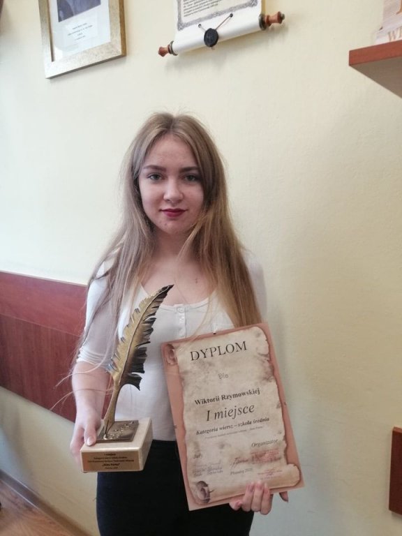 Uczennica klasy II Liceum Ogólnokształcącego im. bp. Jana Chrapka WIKTORIA RZYMOWSKA zdobyła I miejsce w kategorii wiersz - szkoła średnia. Wiktoria napisała wiersz "Cisza" i odczytała go na uroczystej gali.