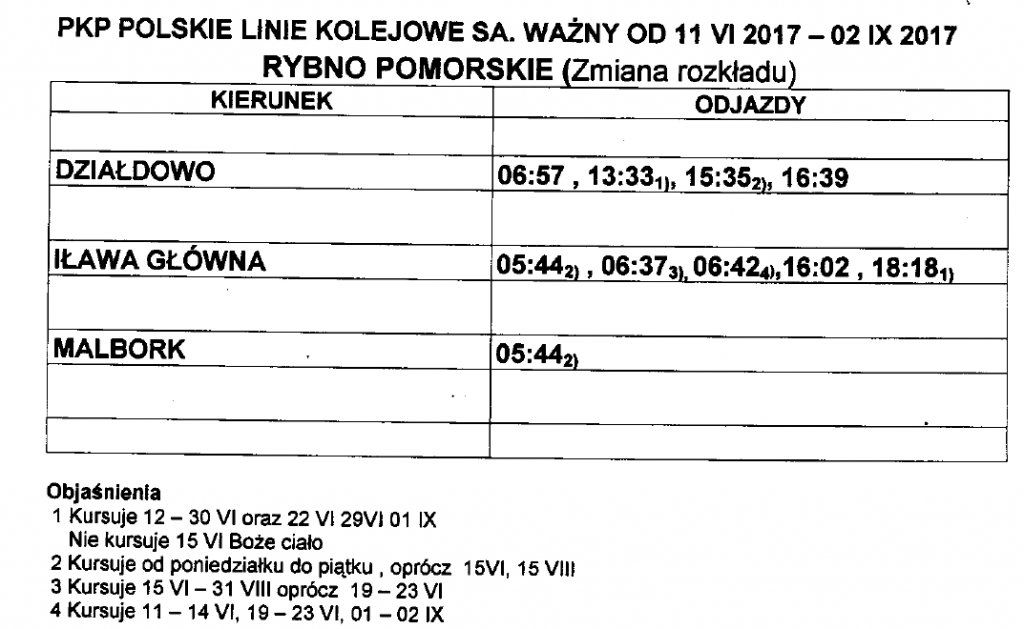 Poniżej załączona została tablica odjazdów dla stacji PKP Rybno Pomorskie.