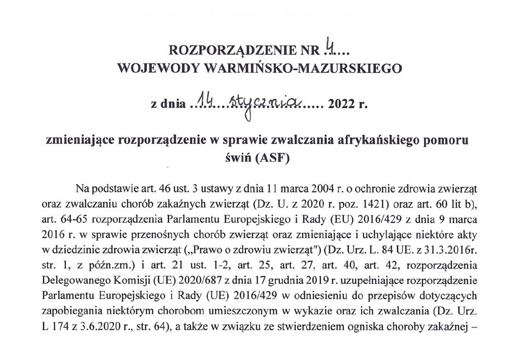 W dniu 14 stycznia 2022r. Wojewoda Warmińsko-Mazurski wydał rozporządzenie w sprawie zmiany rozporządzenia dotyczącego zwalczania afrykańskiego pomoru świń (ASF).