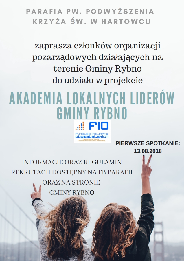 Parafia pod wezwaniem Podwyższenia Krzyża Świętego w Hartowcu zaprasza członków organizacji pozarządowych działających na terenie Gminy Rybno do udziału w projekcie pod nazwą "Akademia Lokalnych Liderów Gminy Rybno".
