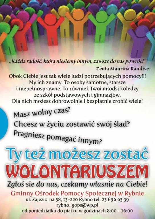 Gminny Ośrodek Pomocy Społecznej w Rybnie zaprasza wolontariuszy do współpracy.