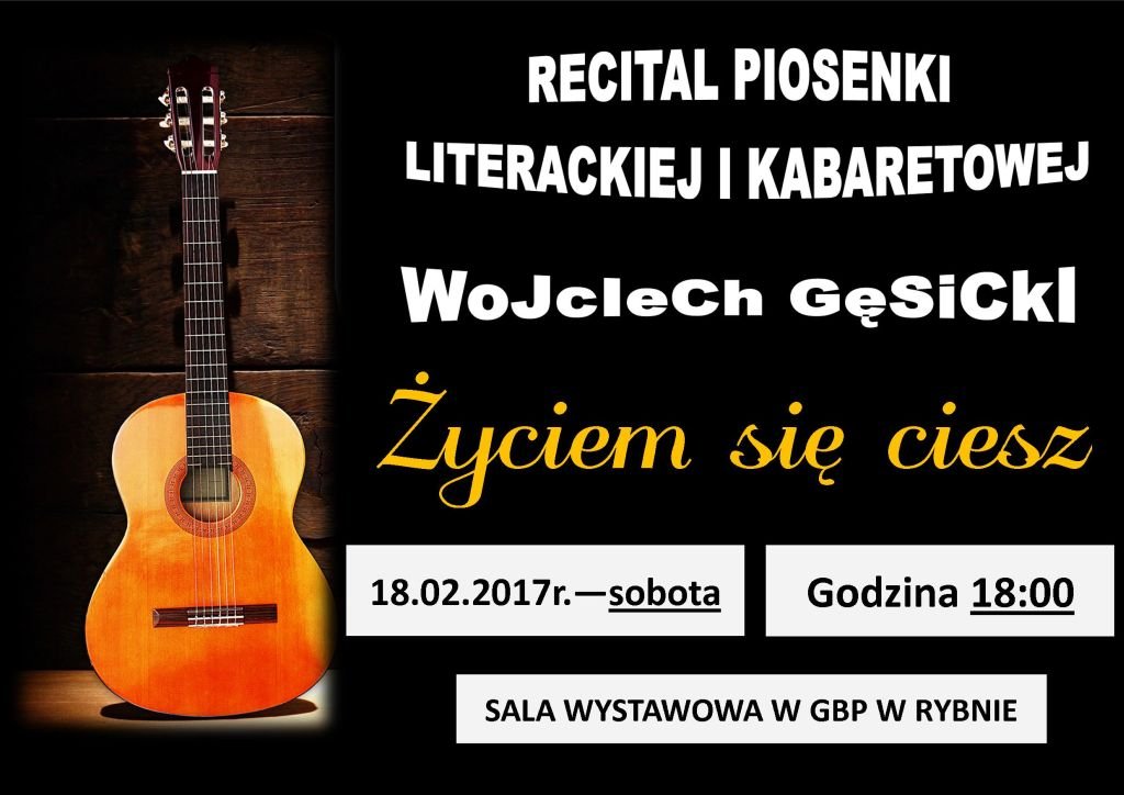 Gminna Biblioteka Publiczna w Rybnie zaprasza na recital piosenki literackiej i kabaretowej pt. "Życiem się ciesz" w wykonaniu Wojciecha Gęsickiego.